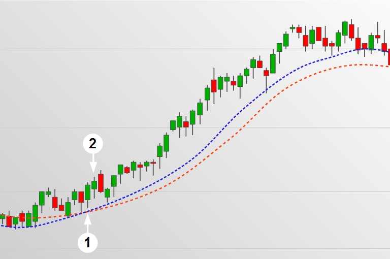 Ein Long-Signal entsteht, wenn der schnelle EMA den langsamen EMA von unten nach oben kreuzt.