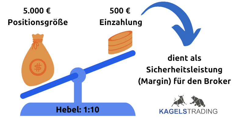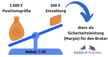 Berechnung: Wie der Trader durch Margin mit nur 5.000 Euro Kapital eine Position im Wert von 10.000 Euro kontrollieren kann.